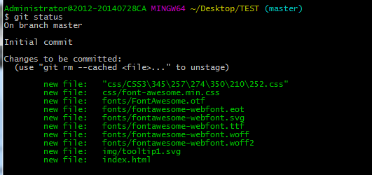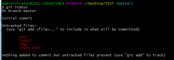 第三步:这时候你就可以把你的项目粘贴到这个本地Git仓库里面(粘贴后你可以通过git status来查看你当前的状态),然后通过git add把项目添加到仓库(或git add .把该目录下的所有文件添加到仓库,注意点是用空格隔开的)。在这个过程中你其实可以一直使用git status来查看你当前的状态。