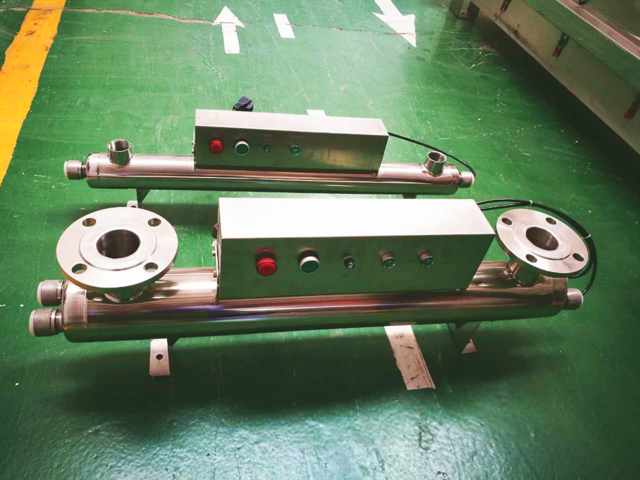1、注意事项:本装置水平安装在室内,将支架固定的基础或工作台上,(接通进水口,出水口装置在室内的位置,除考虑上下水方便,符合工艺流程要求外,还要注意留有安装位置能抽出紫外线灯管的空间,分体式设备的电控箱安装在装置附近,环境相对湿度不大于40℃,无腐蚀性气体、无导电尘埃、无强烈震动和冲击。