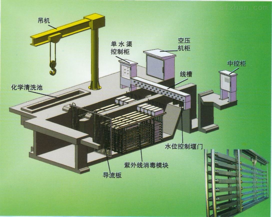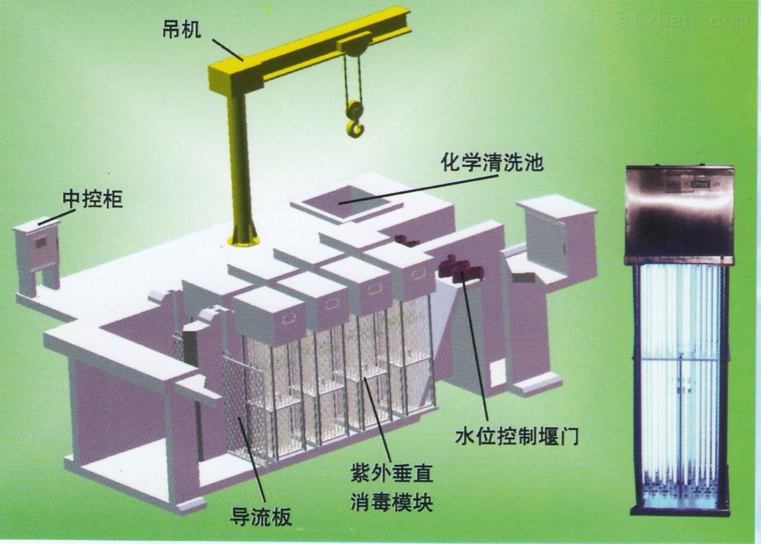 10、设备维护吊车: 安装、维护均可用吊车吊离水面,维护或检修时无须中断整个系统(甚至其它消毒模块)的运行。同时,即使一个消毒模块出现故障也不会影响别的消毒模块的运行,只需将发生故障的消毒模块维修或更换,系统又可正常运转。